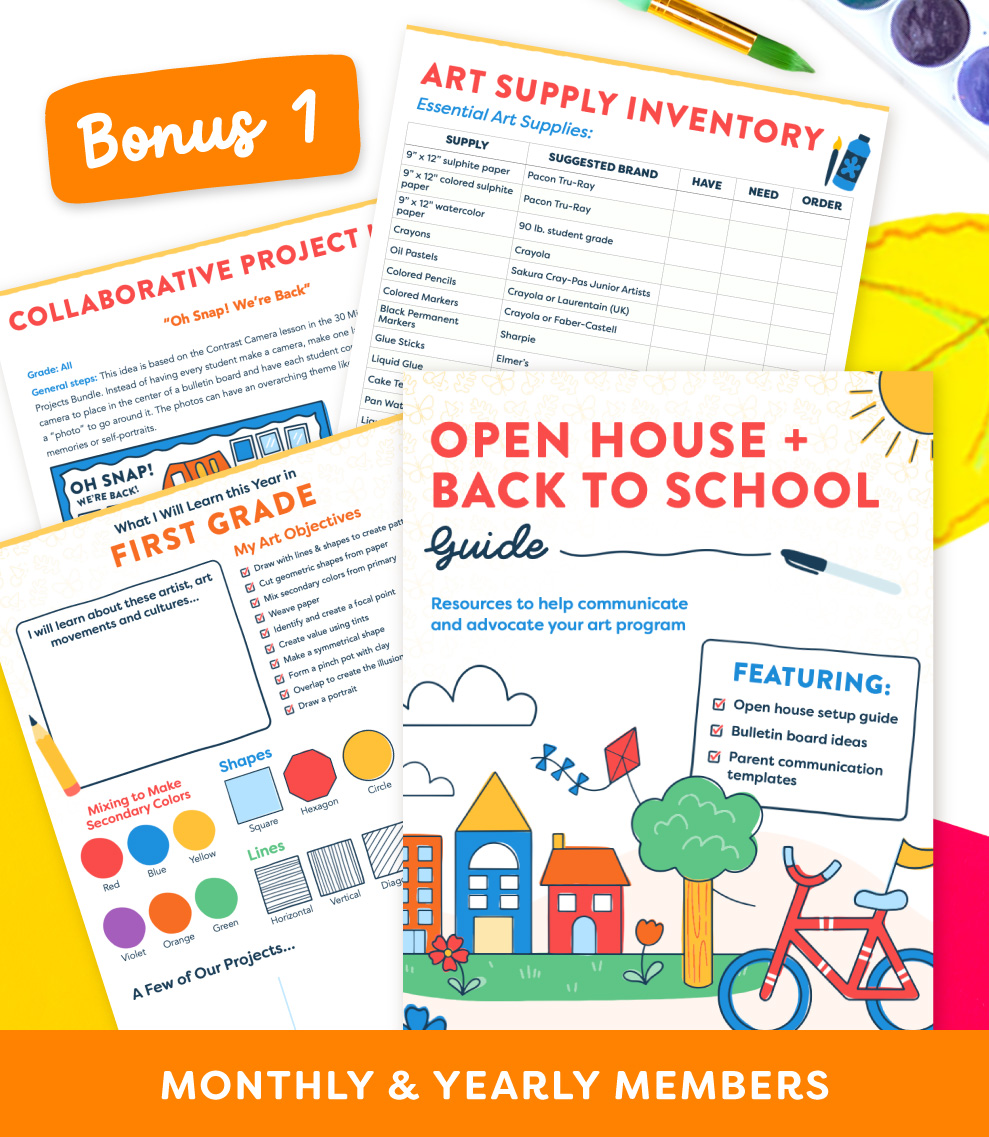 • Instant Access to all 9 EASE Curriculum Lesson Bundles (72 art lessons + coordinating resources)